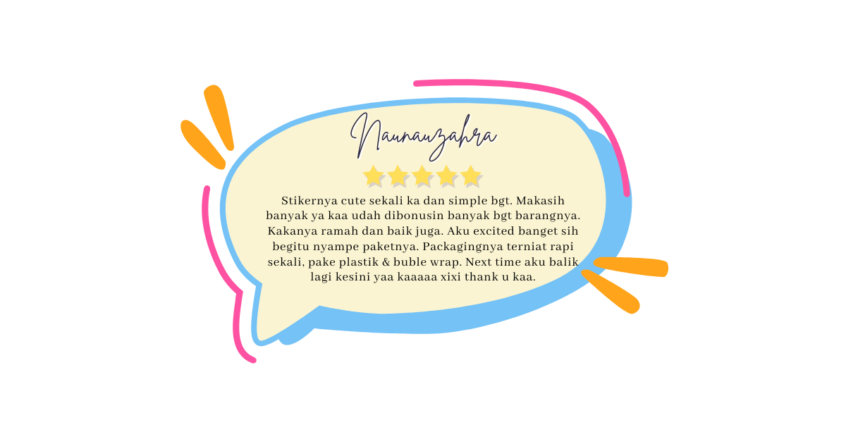Semua pesanan kami packing dengan kemasan yang aman, rapi, dan penuh warna sesuai slogan kami "Make Your Day Colourful". Pesanan dipastikan aman mendarat sampai ke tangan pelanggan tercinta! Tidak lupa setiap pesanan akan mendapatkan bonus stiker dan wooden clip, kartu ucapan terima kasih, dan ucapan manis dari kami.